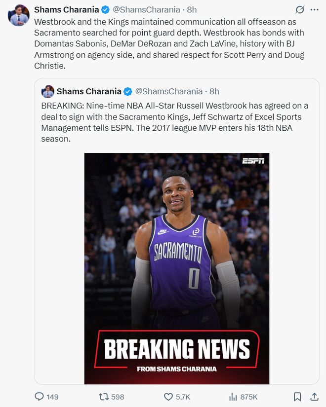 Shams:拉塞尔-威斯布鲁克一年360万美元合同加盟国王
